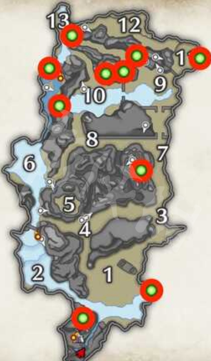 建議採集狐火酸漿的路線,開始的時候,從初始營地出發,然後在營地的後面可以看到一個大翔蟲,點擊就可以飛上去,然後跳下來就到了圖中初始營地綠色點的那個位置採集,然後騎上狼犬,到地圖1號區域的右邊水的旁邊有個綠色的採集點。