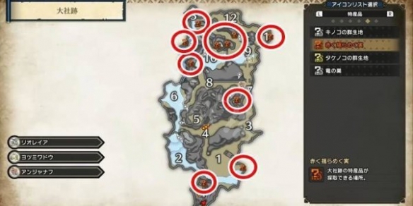 狐火酸漿的位置是在廢神社的這張地圖中,可以看到圖中綠色的點就是狐火酸漿的位置,是有幾率採集到的,大部分都會採集到其他的,需要大家耐心的去採集。
