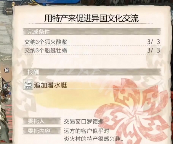 潛水艇任務一完成方法就是交三個狐火鬼燈和三個船艇牡蠣。其中狐火鬼燈在大社遺跡里找紅色果實,船艇牡蠣在寒冷群島找 牡蠣群生地。