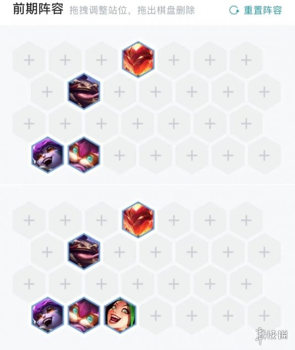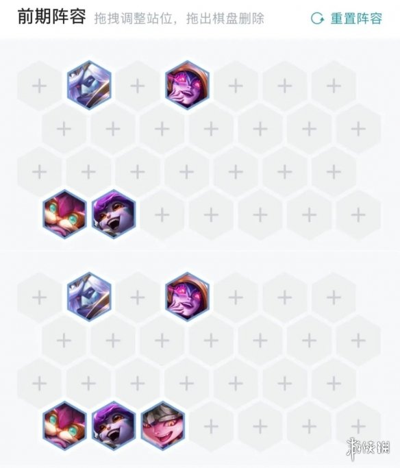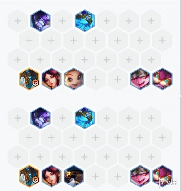 前期搭配思路一(2-1上4,2-4上5)分別為小炮、大頭、金克斯、塔姆、慎。