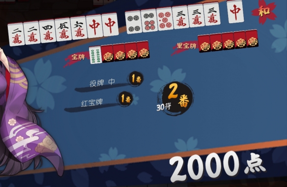 比如這一局,符底20+三元2,一共22符,不到10符的以10符計算,因此是2番30符。帶入公式計算為30*2^(4+2)=1920,不到100點的以100點計,所以最終就是2000點。