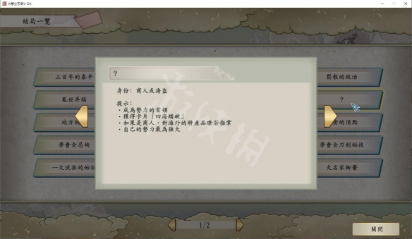 要等到自家大名(由計算機操控)武力征服全部大名or支配力3萬6以上升至正一位進武士結局。