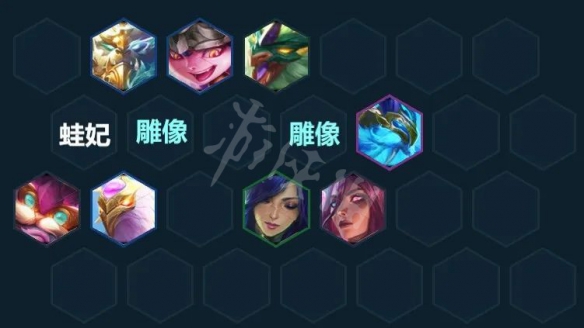 後續可以考慮在八級繼續搜三個半神單位的3星或是拉九補充佐伊搏一搏上限,站位上小超測試是半神單位會優先獻祭鄰格左下的單位,如果不一樣就根據實際情況站位讓狗熊吃蛙妃,奧恩和鳳凰各自看情況吃盲僧和烏鴉就行。