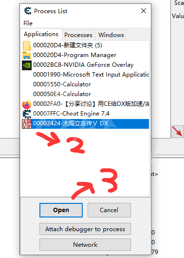 第二步:進程里選擇太閣,然後點下方open(漢化版應該是叫”打開“吧)