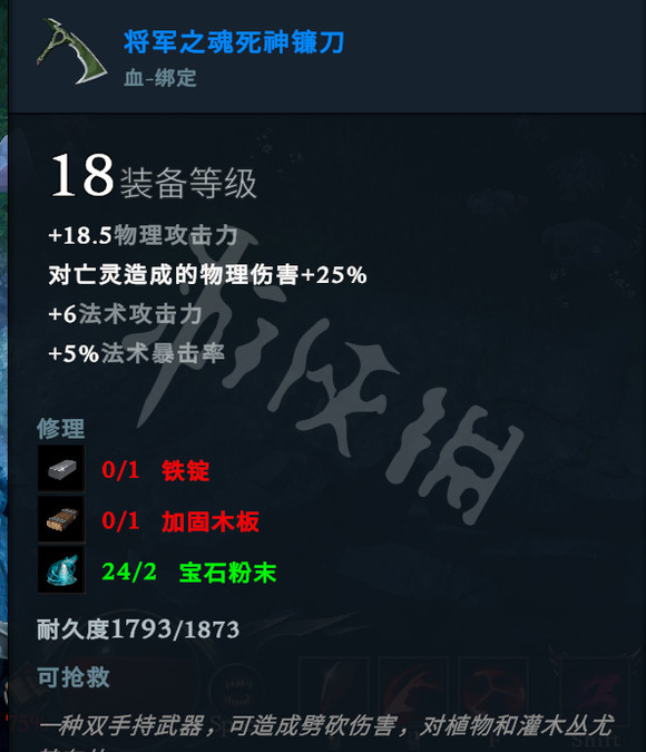 V Rising將軍之魂死神鐮刀屬性可以見上圖,該圖紙不能使用研究獲得。