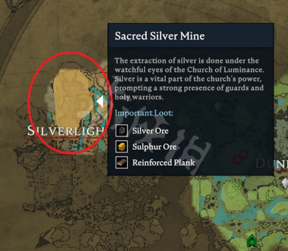 您可以在Silverlight Hills地區或Sacred Silver Mine(是Silverlight Hills的一個區域)獲得銀礦。您可以從高級怪物或詛咒教堂(鄧利農場以北的一個地方)獲得天災石。