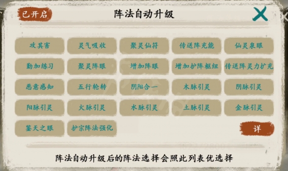 最後的仙門陣法升級怎麼選擇?游戲中的陣法有許多種升級選項可選,有些玩家可能不知道該先升級哪項,今天小編給大家帶來最後的仙門陣法升級順序推薦分享,快來看一下吧。