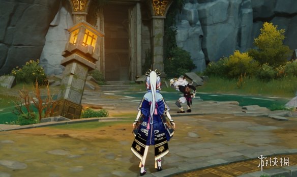 可以帶個岩主,凝光,鍾離之類的角色,從傳送點向右邊跑,放個岩造物在壓力板上,生成風場,飛到風場的最頂,再爬一段距離,到石門最頂上就可以看見啦。