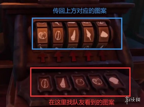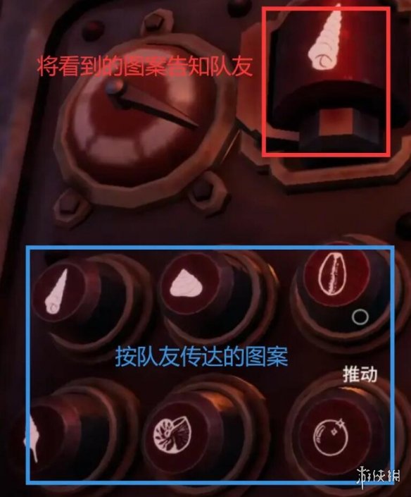 該謎題每隔一段時間會重置,需要右邊玩家第一時間把看到的圖案報過去,左邊玩家在下面一行找到圖案以後把上面對應的圖案報回去,右邊玩家再按對應的按鈕,重復四次,每次成功亮一燈。