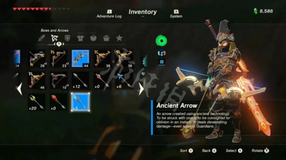 射程極遠,耐久度極高,可以裝備任何箭矢,在穿上古代裝備時攻擊力可以達到79。傷害高就是王道。