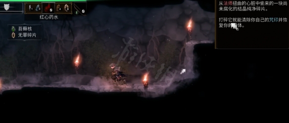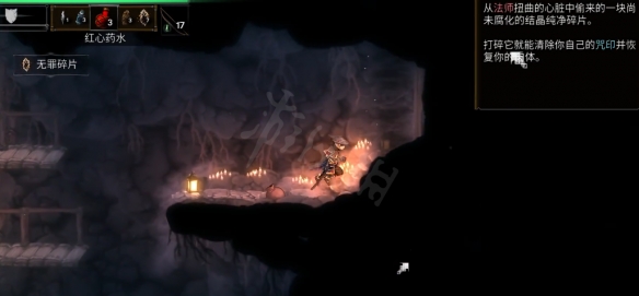 一直原路折返回到存檔點左方的洞穴,來到洞穴最底部,有一個小精英怪,將其擊殺後可以獲得另一個無罪碎片。
