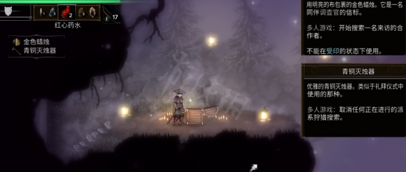 撿到上文所述的無罪碎片後繼續向前,可以出到洞穴外面,前邊有一個寶箱,打開後可以獲得金色蠟燭和青銅滅燭器。