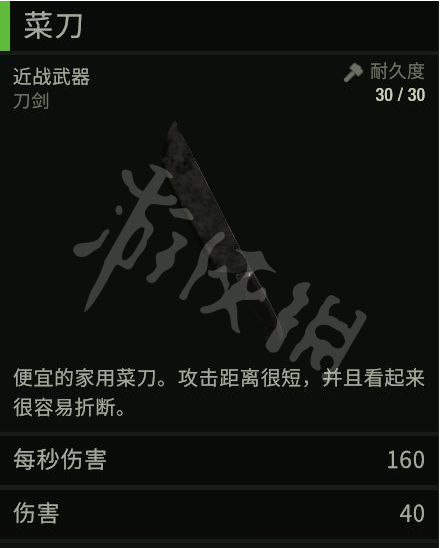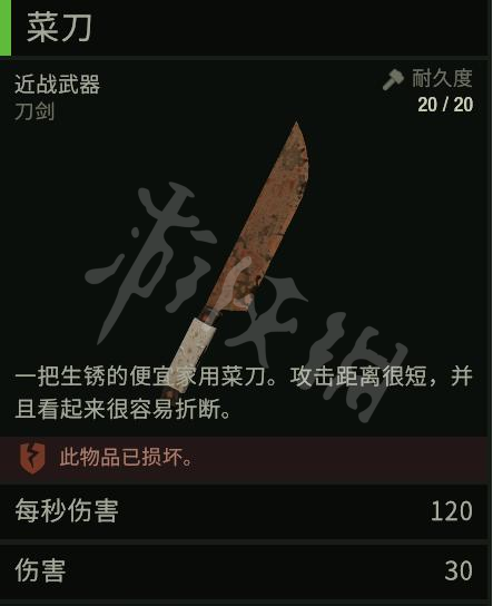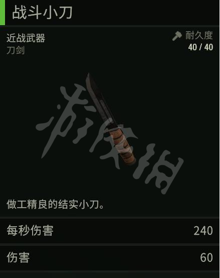 首先是1.1版新增的單手近戰武器天花板,戰術刀。戰術刀的傷害高達120,耐久度也有70,而且重量也只有2,總之就是一個非常優秀的武器。