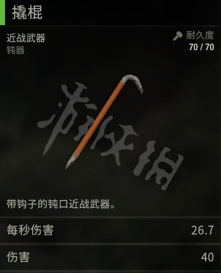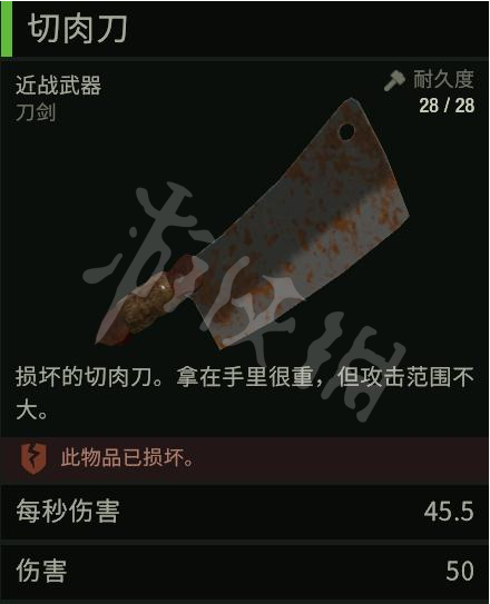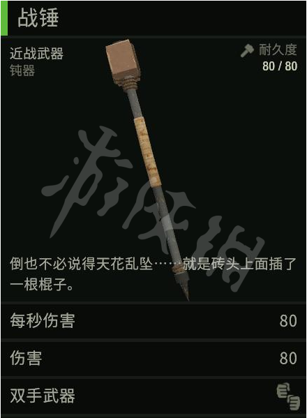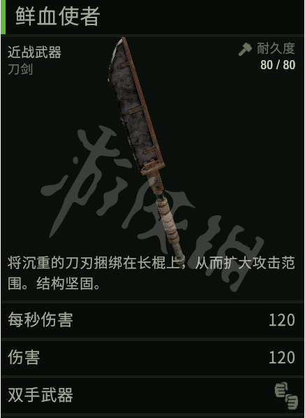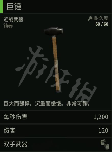 雙手鈍器,傷害120已經算挺可觀的了,然而它耐久度相比來說沒其他沉重武器那麼強。相比來說也更容易壞一些。