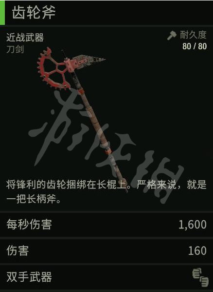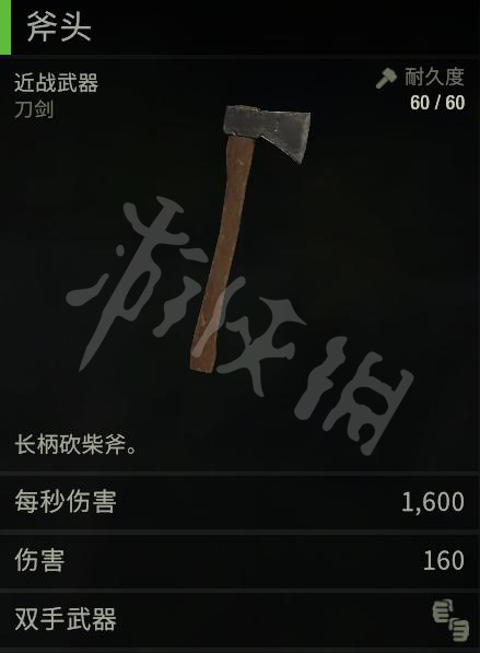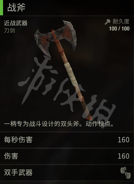 最後是戰斧,戰斧非常重,是全遊戲近戰武器里最重的。然而其傷害並沒有因此有額外提升,依然是160。而只是在耐久度上更高一些。