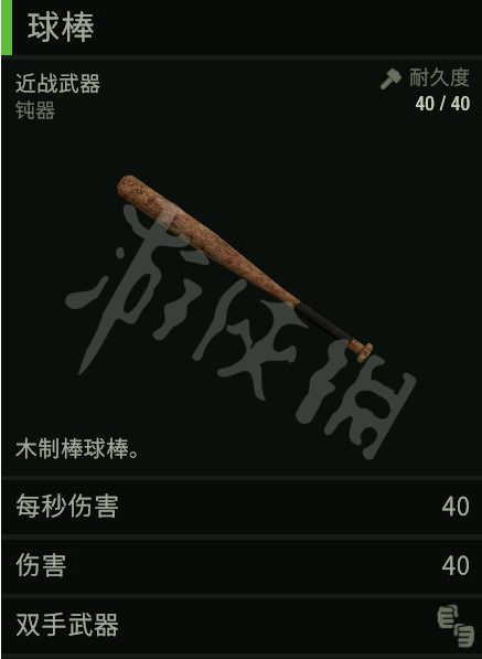 球棒家族都是雙手鈍器,除了狼牙棒是由球棒與近戰零件合成出來因而帶刃可以造成流血效果。狼牙棒的合成也可以快速合成,不需要工作台就可以實現。