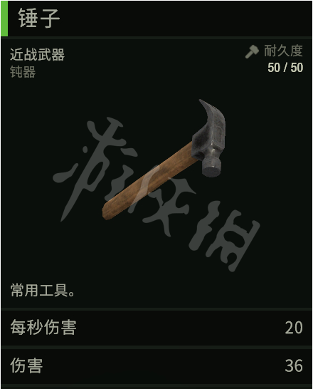 然後是戰錘,戰錘是製造工作台合成武器,合成路徑是磚塊+近戰零件。相比巨錘,戰錘耐久更高,也更重,但傷害也更低,而且同樣是合成,下一個武器鮮血使者傷害更高,因此戰錘實在沒有太大的合成必要。