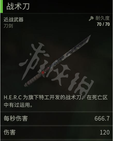 戰鬥小刀,這個經常在軍事裝備箱和HERC殭屍身上出現,耐久不高,但是很輕,傷害也算不錯,可以留著用於守沙袋時用於放血,在四區遭遇近戰時也比較好用,可以不急著用掉。