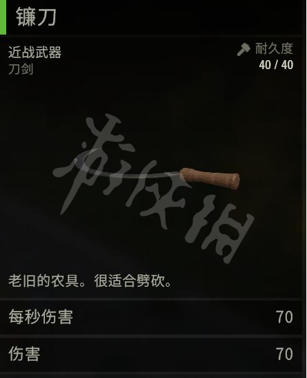 鐮刀一般在二區農村和四區城鎮里出現,雖然比較少見,但屬性就是一個弱化的砍刀。因此可以當消耗品用掉就行了(不過比鐮刀還差的近戰武器有很多,所以要先用掉那些才輪得到鐮刀)。