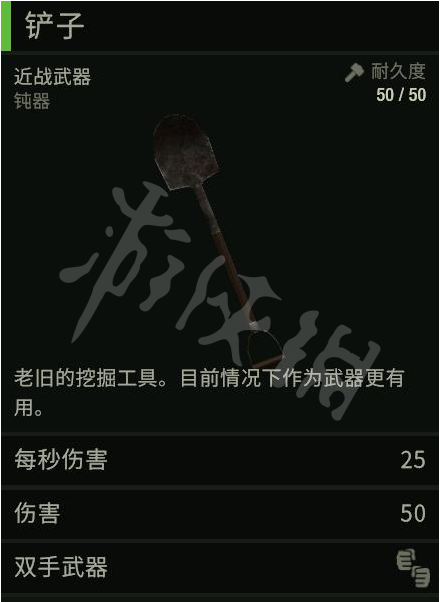 鏟子一般在長柄工具箱中出現,算是比較少見的武器,然而強度並不行,重量重,傷害不大,因為傷害不大導致作為雙手武器的攻擊速度慢的缺點就更明顯了。建議是盡早在二區內多使出迴旋擊用掉它。