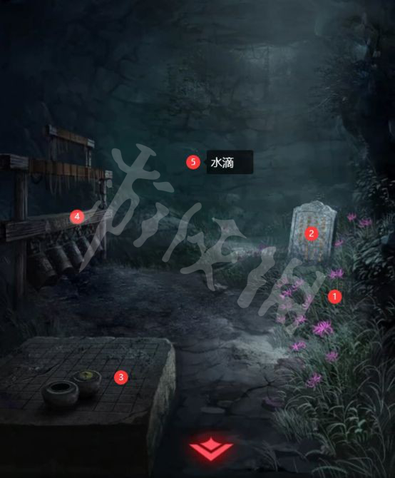 再折回第五場景,使用筆筒調查5-5的水滴,完成小游戲後得到香爐需要的無根之水
