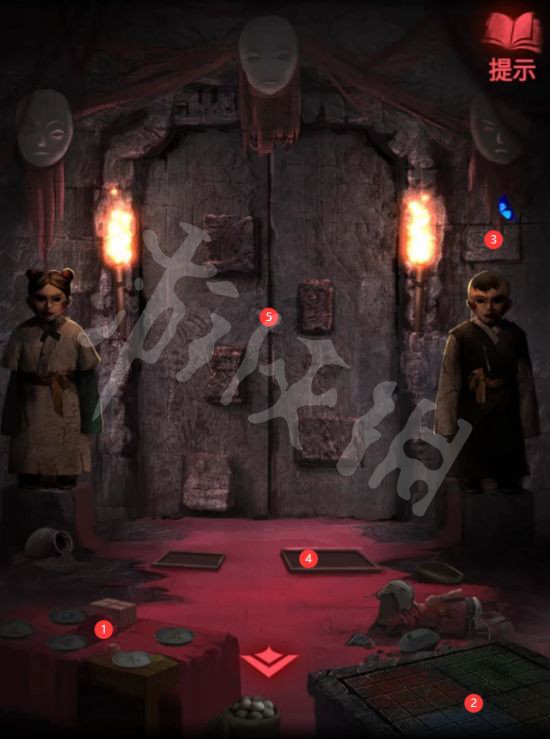 回到第一個場景,1-4托盤處,把泥叫叫和木劍分別放上之後,拿出手機,兩個童子所指的就是開門的順序,每按一下就得重新拿出手機再看,我的順序是 從上至下14325