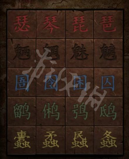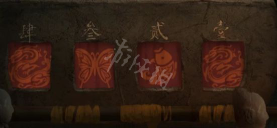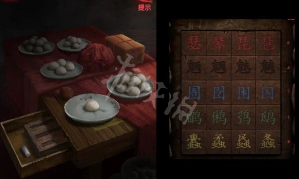 完成拼圖後,牆面變成線索(線索指向1-1盤子上的字),這裡的就是觀察相同的地方,比如第一行都有王共8個,第二行4個鬼,第三行5個口,第四行看似是鳥,但1-1的盤子上是木,第四行則是8個蟲