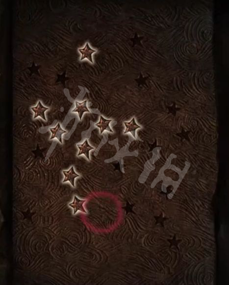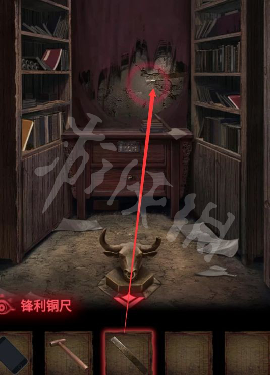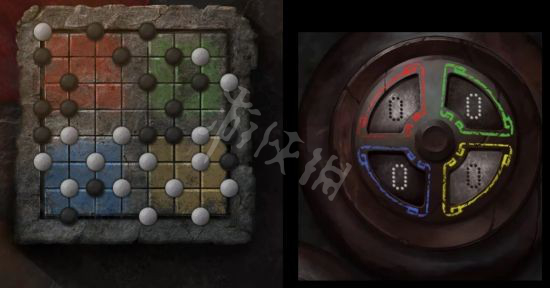 首先拿取中間的羅盤指針。之後調查左邊牆面,拿出手機可以看到4句話,然後點擊左邊盒子解謎,4句話的線索就是用在這的,完成圖如下