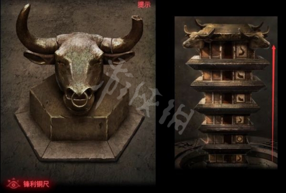 之後調查4-7的牛頭,塔上圖標的線索指的就是這,塔是倒著的,所以順序是從下往上點擊牛頭的各個部位