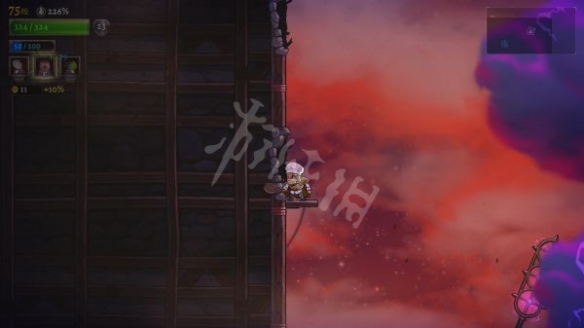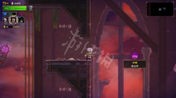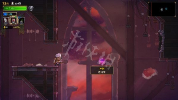 往右走到頭,下提旋轉的擺臂往上跳到平台上。
