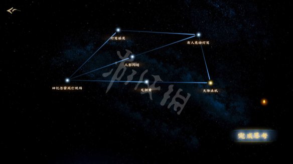 【回憶忽雷死亡現場】選擇【燈籠搖晃】、【人影閃過】和【龍膽黃】,【燈籠搖晃】關聯【人影閃過】得出【有人晃動燈籠】,【龍膽黃】關聯【有人晃動燈籠】得出【天降殺機】。