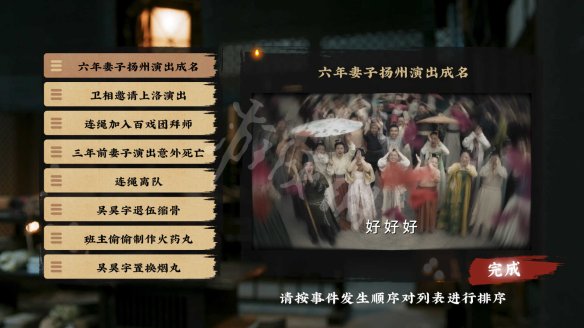 事件正確時間順序為:【六年妻子揚州演出成名】—【衛相邀請上洛演出】—【連繩加入百戲團拜師】—【三年前妻子演出意外死亡】—【連繩離隊】—【吳昊宇退伍縮骨】—【班主偷偷製作火藥丸】—【吳昊宇置換煙丸】