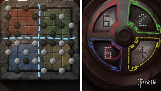 紅有黑子6個-黃有黑子4個-綠有白子2個-藍有白子6個,解鎖空洞中的棋罐,獲得黑白擺件。