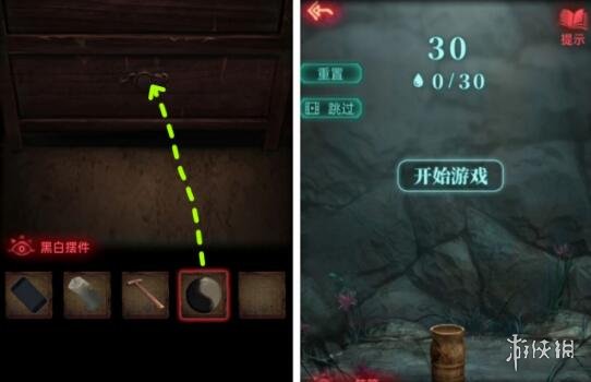 用黑白擺件解鎖葬經閣內下層抽屜,獲得筆筒,用筆筒在空洞處接雨滴,完成小遊戲即可,獲得一筆筒水。