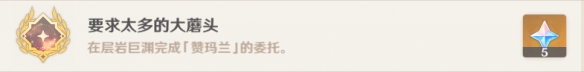 要求太多的大蘑頭是2.6版本中上線的全新成就,完成方法為:在層岩巨淵完成「贊瑪蘭」的委託。