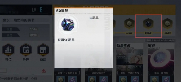 公會每周有保底150墨晶獲取,每周開公會送的盒子還有機會得最多500墨晶。領取的地方如下圖: