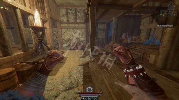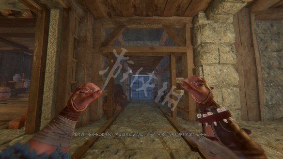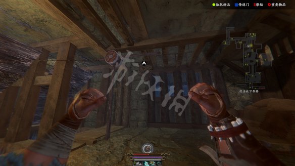 之後啟動轉輪,前方地面擋路的刺槍會消除。不過牆壁里會射出箭矢,根據提示不斷按躲避鍵邊往前走。
