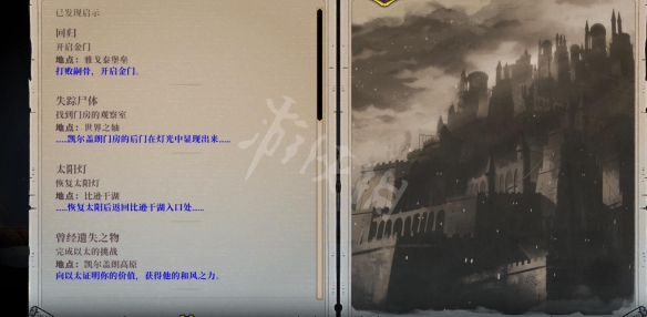 菜單裡面的任務面板里,提供了解密的線索。此處是根據“水中的共情之繩”知道渡河的辦法的,仔細看可以看到河裡共振裝置的光。