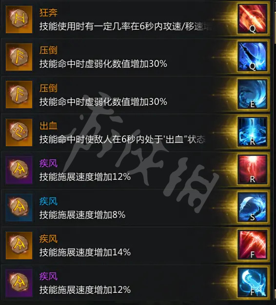 技能符文:赤龍破(金疾風),猛龍烈波(紫疾風),流星落(紫疾風),連環刀(藍疾風),青龍震(金出血),迴旋刀(金壓倒),半月刀(金壓倒),總共7個。