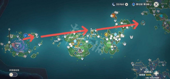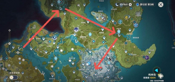 碧水原(位於旁邊有丘丘王的傳送錨點旁)-明冠山地-→風起地-+龍脊雪山-+海衹島-+水月池-→八醞島-艷之庭→千來神祠