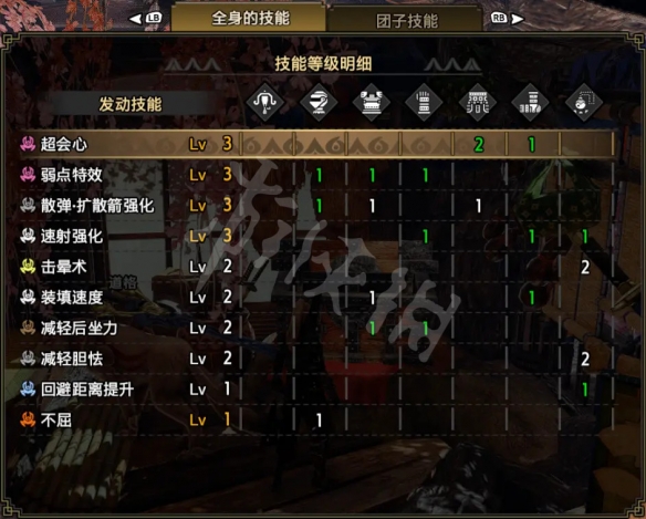 接下來說下配裝思路,根據子彈的特性和武器的選擇,散彈強化必滿,速射強化必滿,會心率上搭配弱點特效3有效部位可達70%會心率,由於攻擊數字較多,配合超會心滿還是非常劃算的選擇,剩餘的技能選擇就只要考慮對應子彈相關技能的提升就好