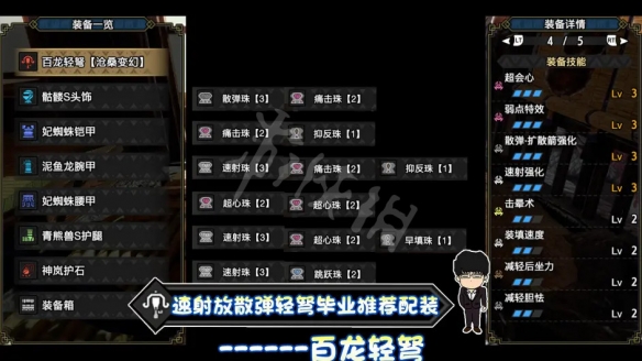 百龍技能方面選擇的是攻擊力強化4,會心率強化,放散彈1,麻痹彈增加2,支持速射【放散彈】,這里需要注意的是放散彈1需要在製作百龍輕弩3的時候先添加,不然之後的百龍輕弩只有放散彈2,這里用1的原因是每一個彈夾中的子彈上限會更多。做滿後依舊可以使用放散彈2