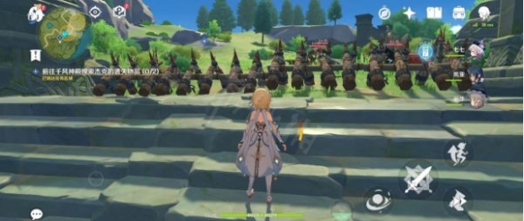 進入範圍1會看到一排木樁,後面還有一群丘丘人,做掉他們。