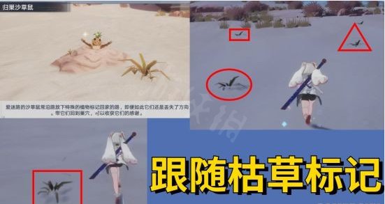 如圖所示的會發光的土堆即為探索點。我們需要在附近找到且跟隨枯草標記,找到沙團,