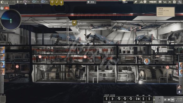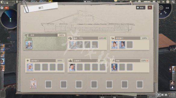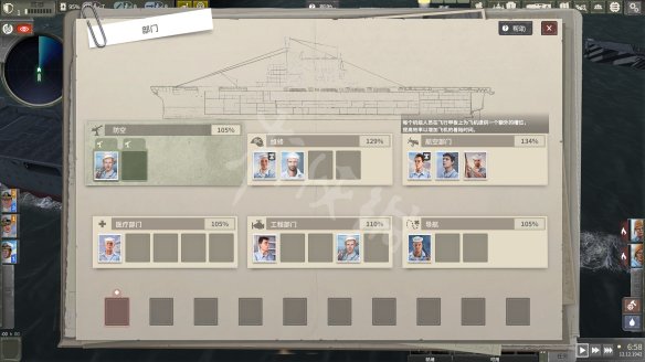 人員部署在遊戲中也相當重要,在人員管理界面可以看到船上成員的分配情況,船上有防空、維修、航空、醫療、工程以及導航共6個部門,每個部門的工作狀況收起分配到的人員數量和整體部門效率的影響。