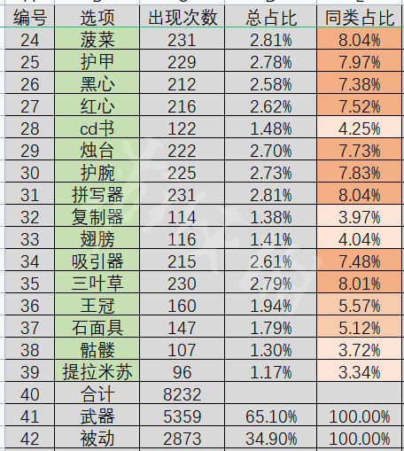 首先是武器部分,在總計8232個選項中,武器出現了5359次,占所有選項的65%