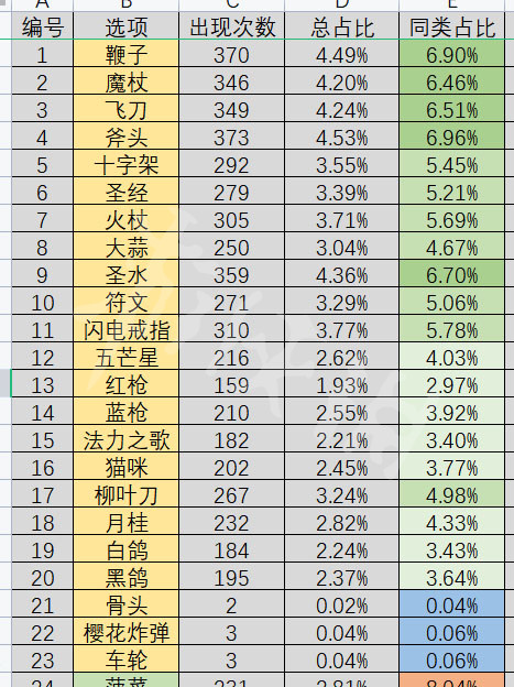 1.特別常見:大於6.5%:鞭子、魔杖、飛刀、斧頭、聖水