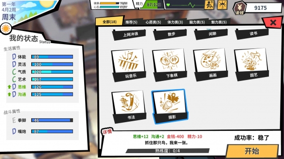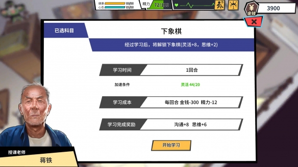 初期在家活動不花錢但屬性增長極低。高級的琴棋書畫本身就要先在老年大學花錢報班學習,若是門檻屬性不足,學習時間還要加倍。即便學成出師,日常玩玩這些雅趣也依然需要花費資金。
