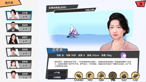 從老伴兒子媳婦孫女,到隔壁鄰居居委會小妹廣場舞大媽老年大學老師......豐富的角色與人物性格讓各自的攻略體驗也各有不同。有的喜歡送禮,有的高冷難以搞定,有的必須豪華餐廳就餐,有的反過來能凈化老房的疲憊。