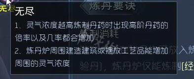 所以如果玩家想要練出高品質的丹藥,就需要先利用高品質的建築和傢具來營造出靈氣充沛之地,最好能夠達到無盡的等級,這樣練出天階丹藥的幾率就更大了。